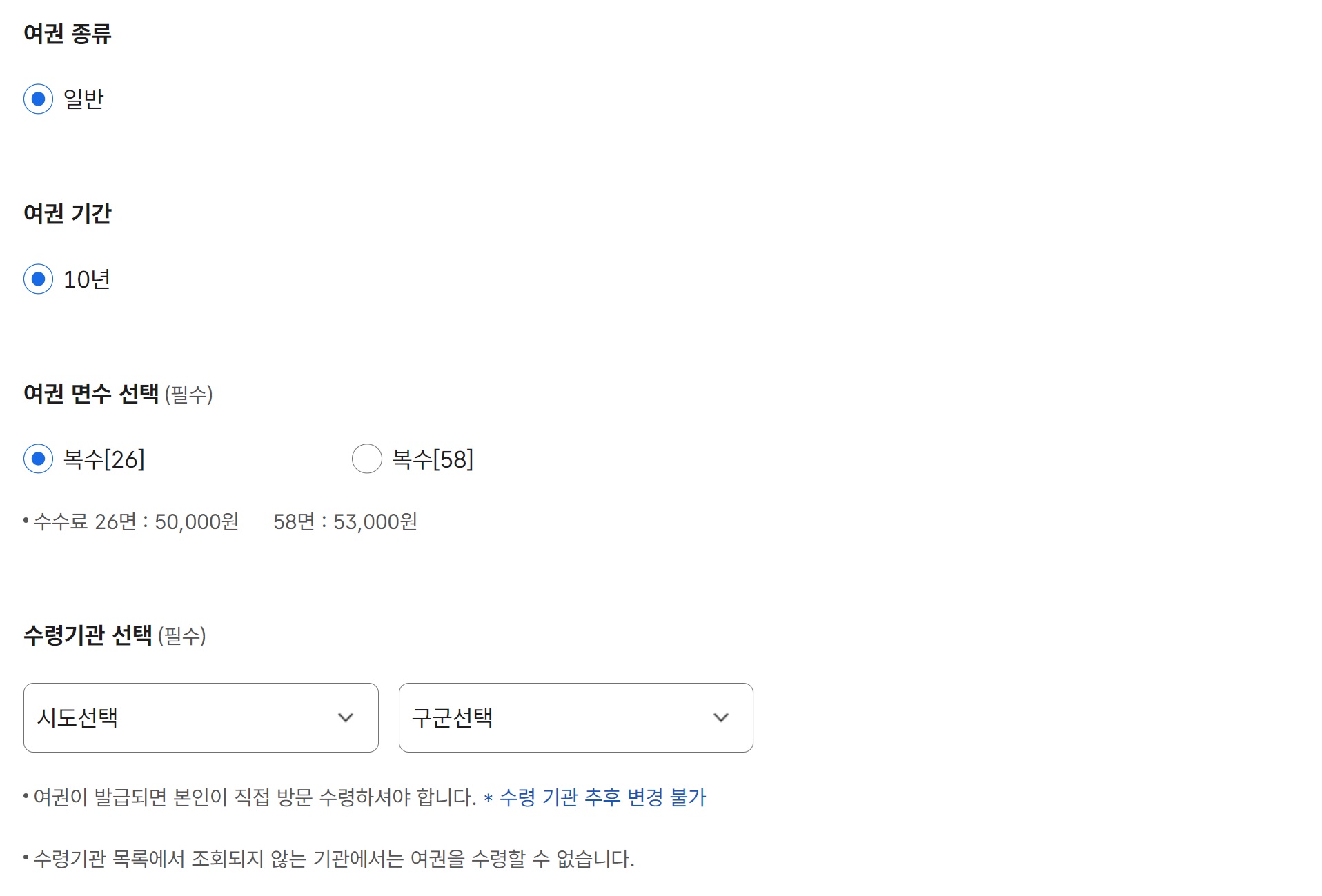 여권 [면수]를 선택하고, 여권을 수령하고자 하는 [수령기관]을 선택하세요.