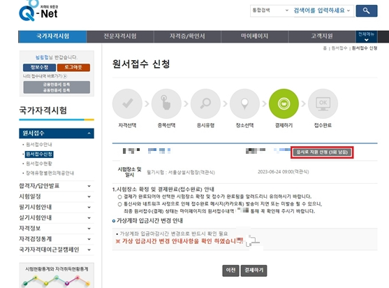 ● 응시료 지원 신청 후 결제 시 지원 횟수가 차감되므로, 지원을 원하지 않을 경우 반드시 결제(원서접수) 취소하시기 바랍니다.