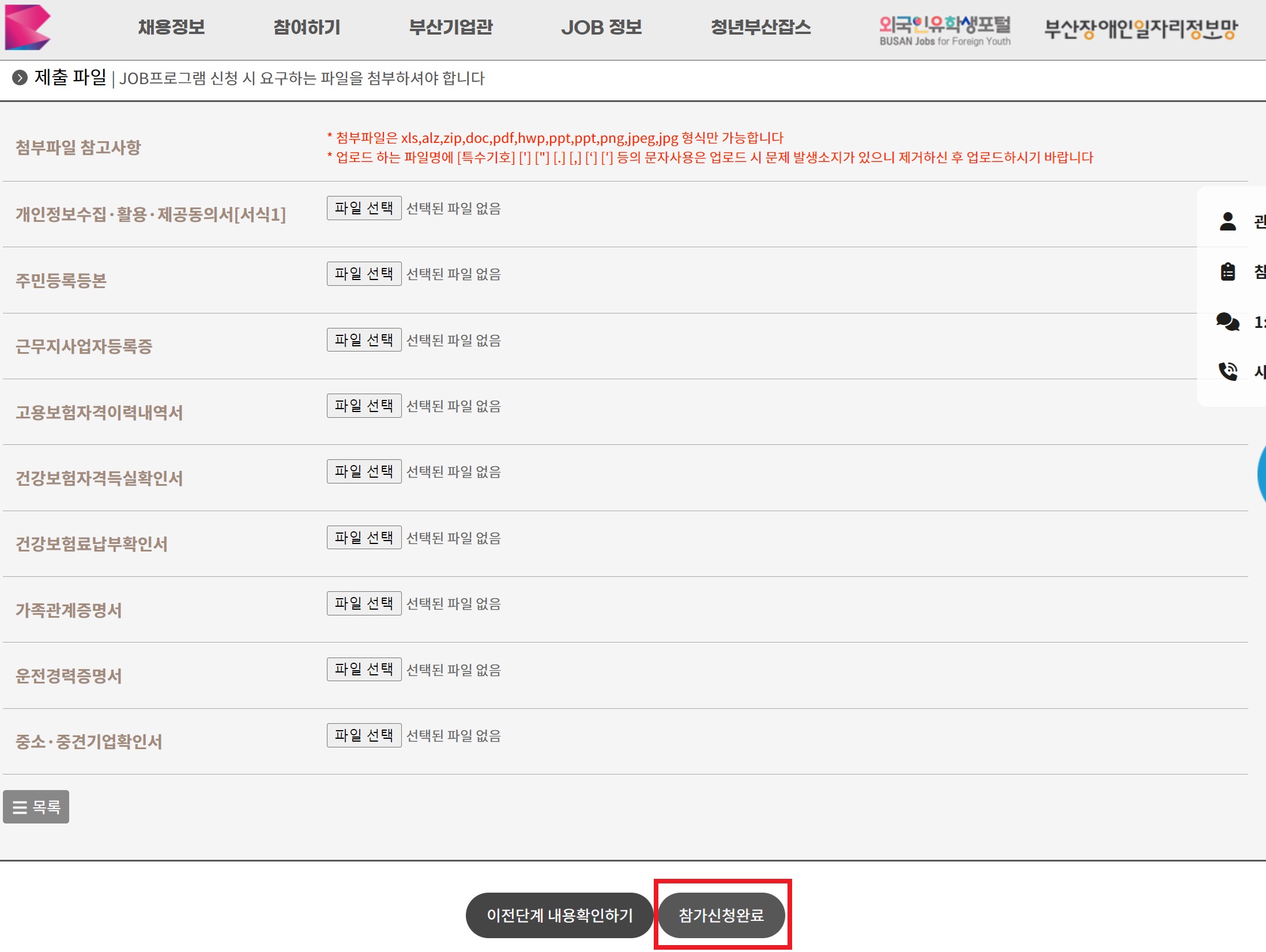 (5) 신청서류 [첨부파일] 등록한 후, [참가신청완료] 클릭하기