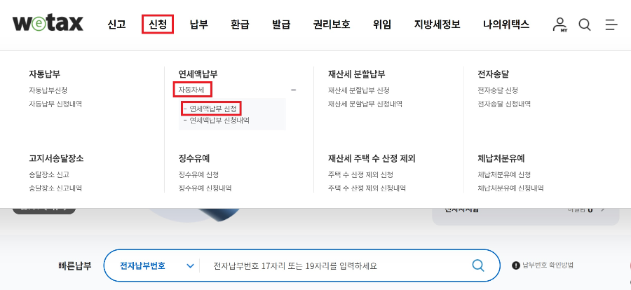 위택스 홈페이지에서 [신청]-[자동차세]-[연세액납부 신청]을 클릭합니다.