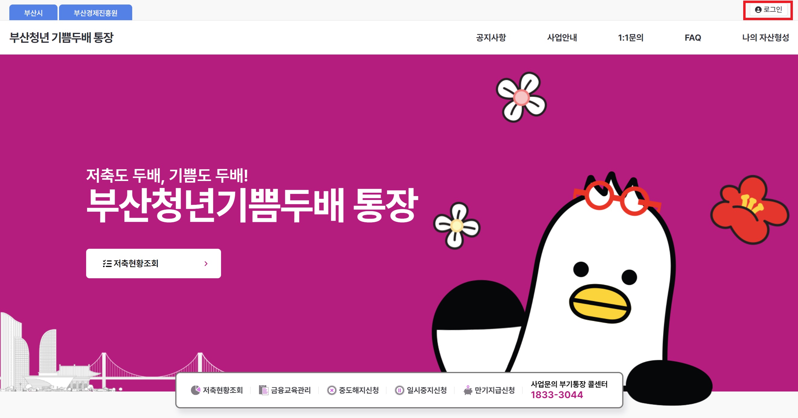 (1) [부산청년기쁨 두 배통장] 홈페이지 접속한 후, 로그인[간편 인증, 공동인증서]을 합니다.