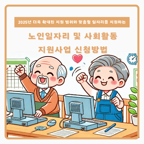 2025년 노인일자리 및 사회활동 지원사업은 고령화 사회에 대응하며, 어르신들에게 안정적인 소득과 사회참여 기회를 제공하기 위해 한층 강화된 정책으로 주목받고 있습니다. 2024년보다 확대된 지원 범위와 맞춤형 일자리 발굴을 통해, 다양한 연령층과 상황에 맞는 일자리를 제공하며, 고령층의 경제적 자립과 삶의 질을 동시에 향상합니다. 특히, 기존의 공공형 일자리 외에도 민간과 연계한 창출형 일자리와 디지털 역량 강화를 포함한 교육형 프로그램이 추가되어, 어르신들의 사회적 역할을 더욱 폭넓게 확대하는 계기를 마련했습니다. 이러한 변화는 고령층의 건강한 노후를 지원하며, 이들의 경험과 역량을 사회에 환원할 기회를 제공해 세대 간 공감과 연대를 촉진합니다. 오늘은 노인일자리 및 사회활동 지원사업의 지원대상, 지원내용 등을 정리해 보았습니다. 신청방법은 다음과 같습니다.
