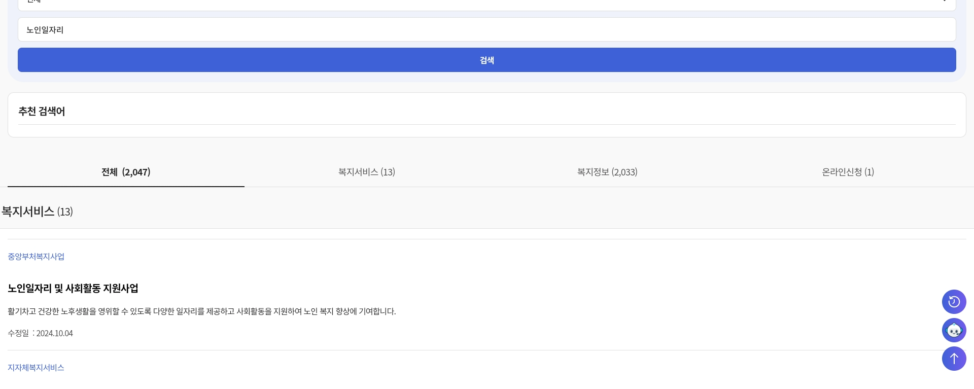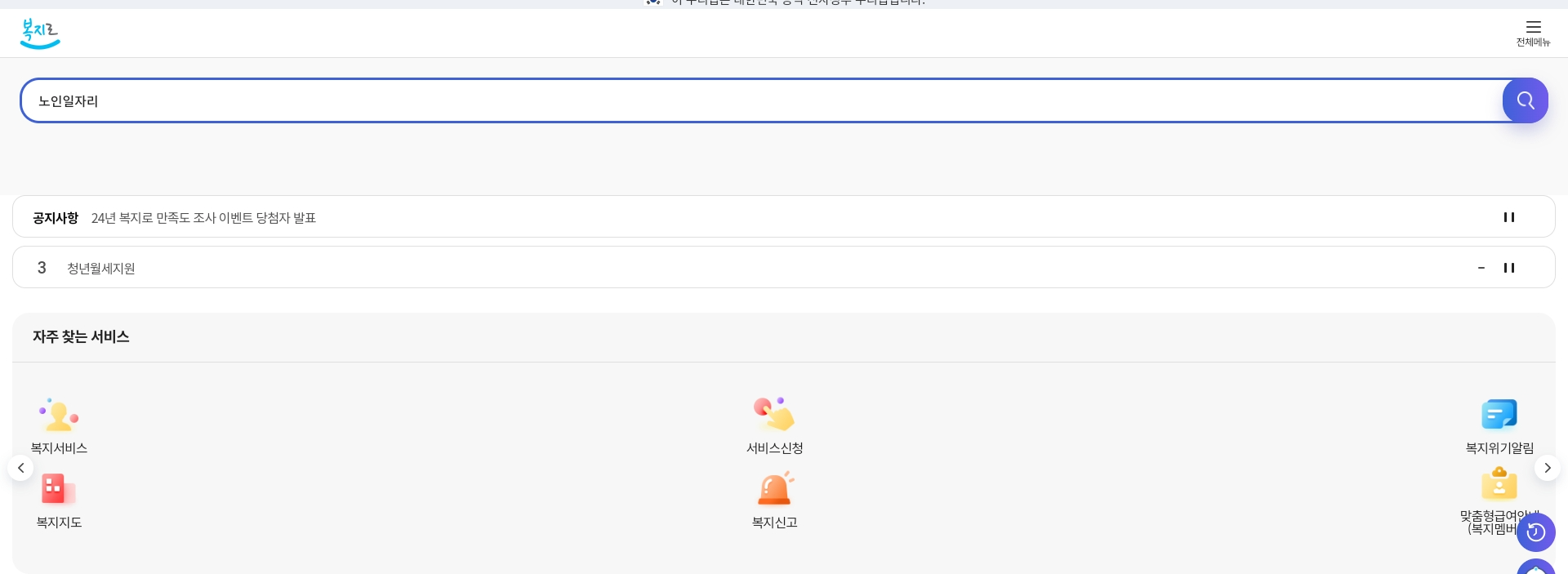 1) 복지로 홈페이지에서 검색창에 노인일자리 검색하기