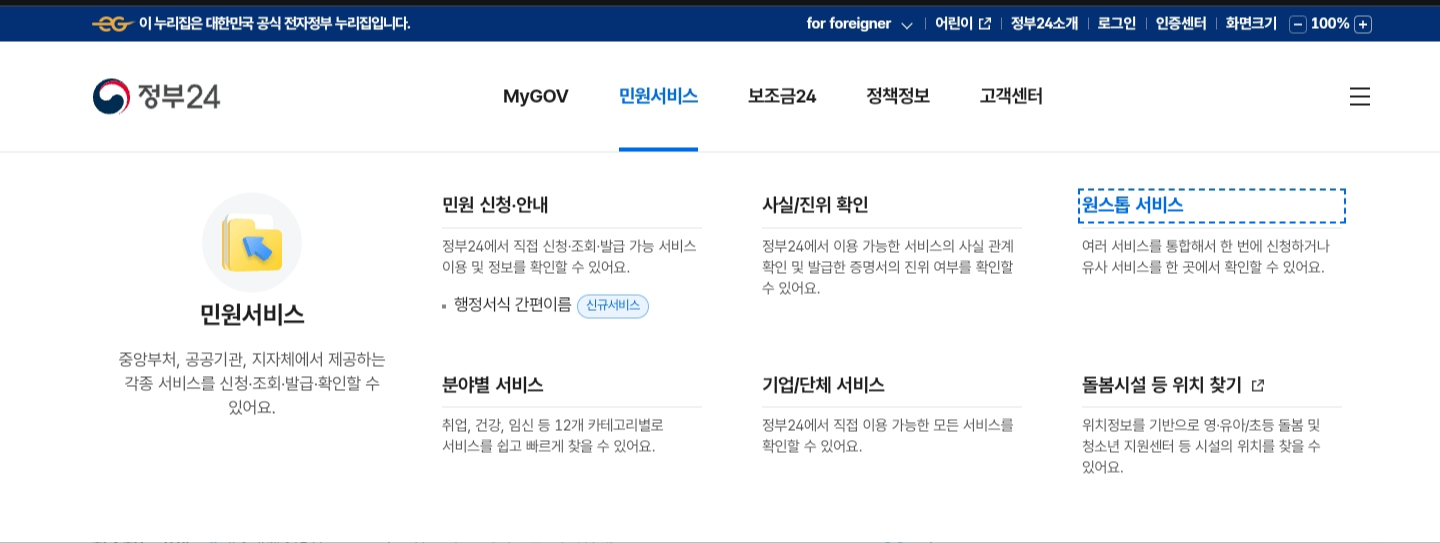 1) 정부 24 홈페이지 - 민원 서비스 - 원스톱서비스 클릭하기