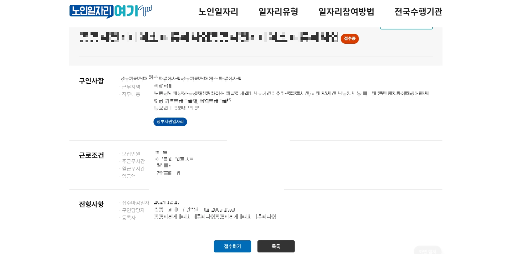 3) 원하는 일자리 정보 클릭 - 일자리 세부 정보 확인 후 '접수하기' 클릭하기