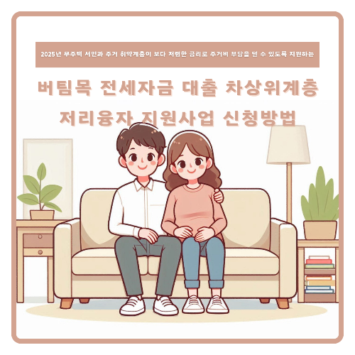 주거 안정은 국민의 기본적인 삶의 질을 보장하는 중요한 요소입니다. 하지만 높은 전세보증금과 월세 부담으로 인해 서민과 차상위계층은 안정적인 주거 환경을 마련하는 데 어려움을 겪고 있습니다. 이에 국토교통부는 2025년 버팀목 전세자금대출 차상위계층 저리융자 지원사업을 통해 무주택 서민과 주거 취약계층이 보다 저렴한 금리로 주거비 부담을 덜 수 있도록 지원하고 있습니다. 본 지원사업은 저금리 대출을 통해 보다 많은 사람이 안정적인 주거 환경을 확보할 수 있도록 돕고 있으며, 다양한 우대금리 혜택과 지원 조건을 갖추고 있어 실질적인 주거복지 실현에 기여하고 있습니다. 오늘은 버팀목 전세자금 대출 차상위계층 저리융자 지원사업의 지원대상, 대출한도 등을 정리해 보았습니다. 신청방법은 다음과 같습니다.