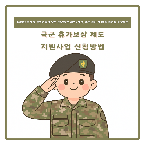 ● 대한민국 국군병사, 휴가 중 독립기념관 방문 관람(방문 확인) 하면, 추후 휴가 시 1일의 휴가를 보상하는 사항에 관란 안내입니다.